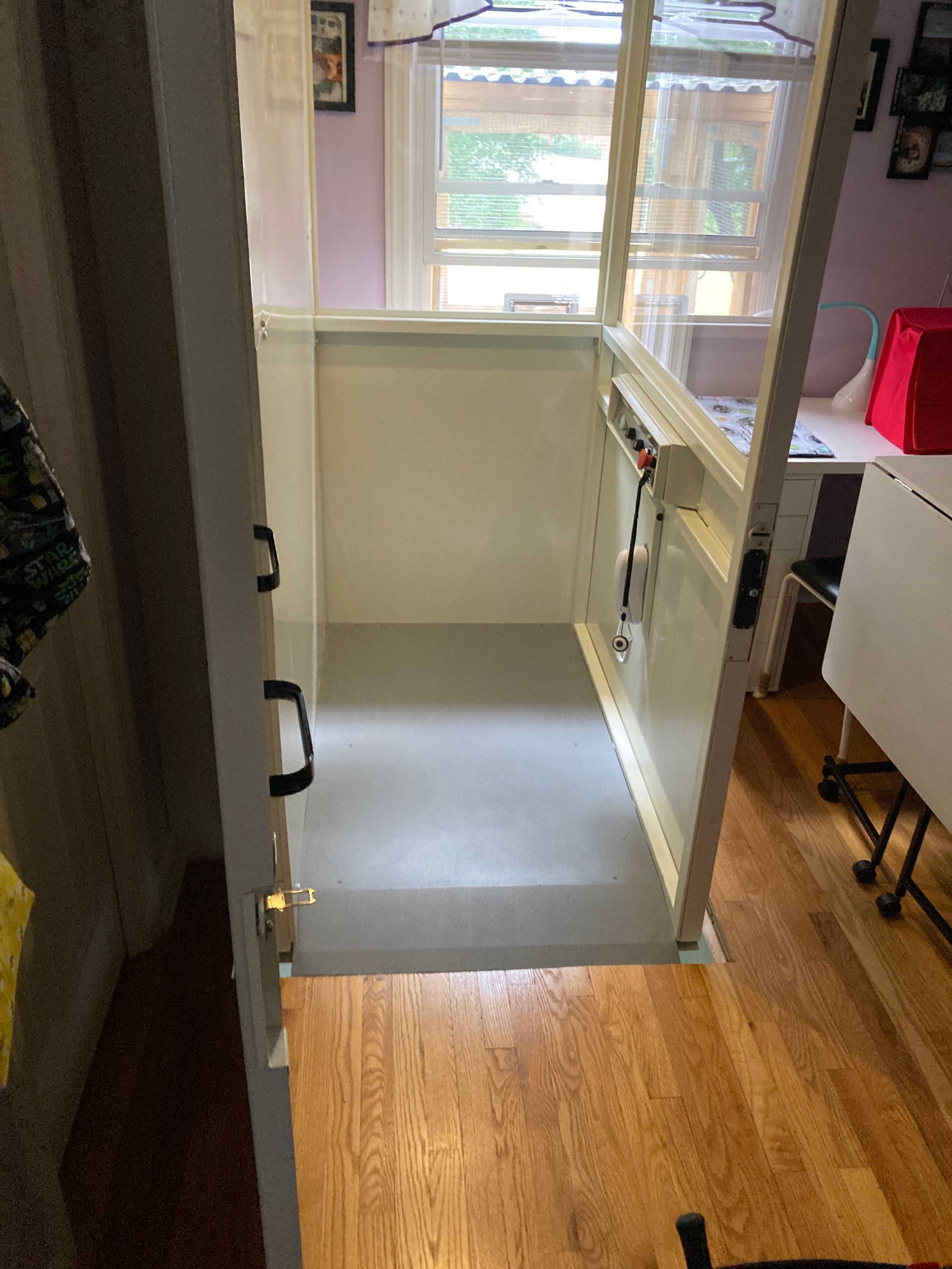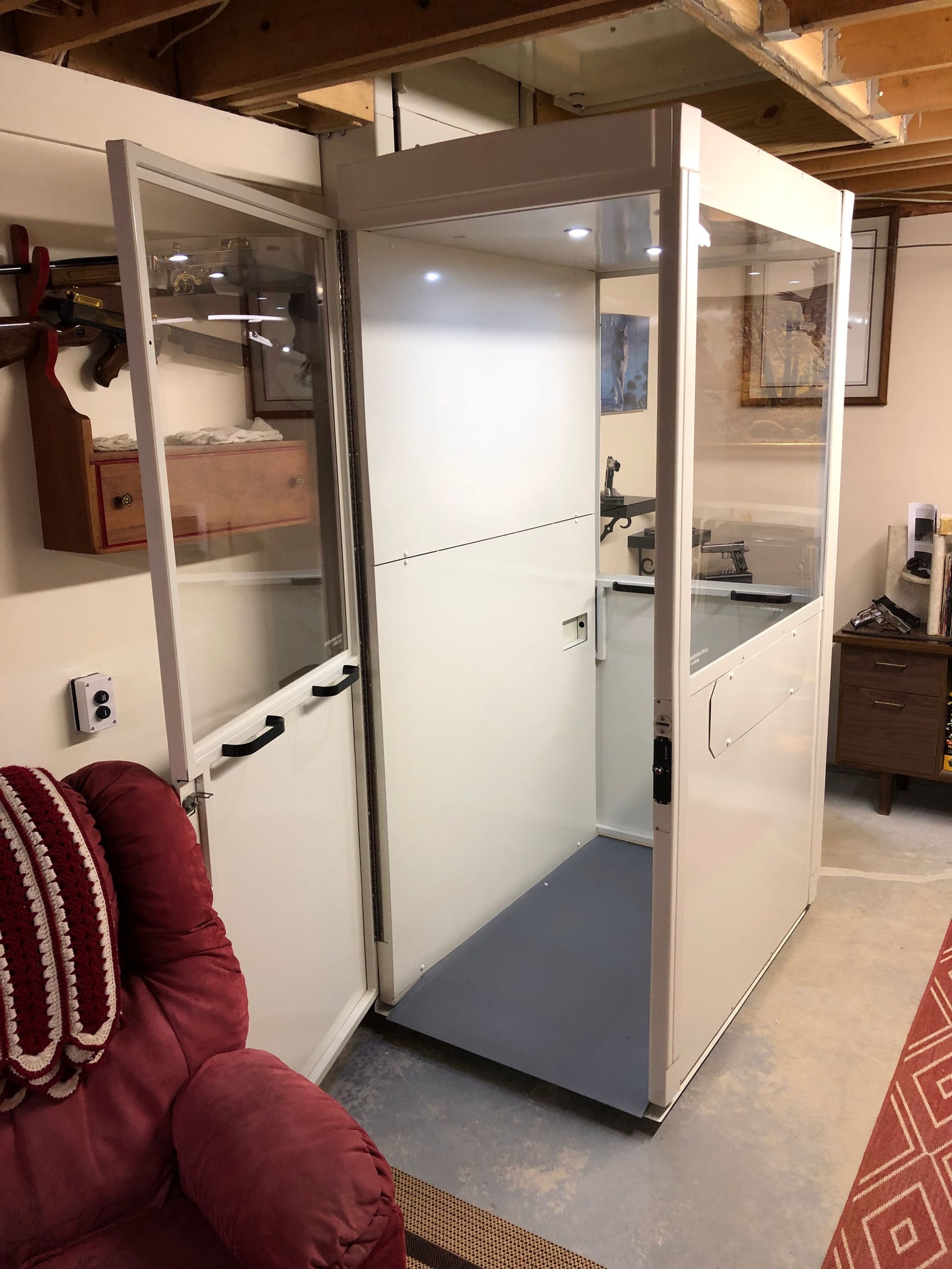 Safety features include interior lighting, emergency stop and alarm buttons, battery lowering in case of power failure as well as manual emergency lowering, telephone, non skid platform, sensors on the top and under-panel to stop the unit if it detects an obstruction, pressure relief valve to prevent platform overload, door interlock, and slack chain safety device.