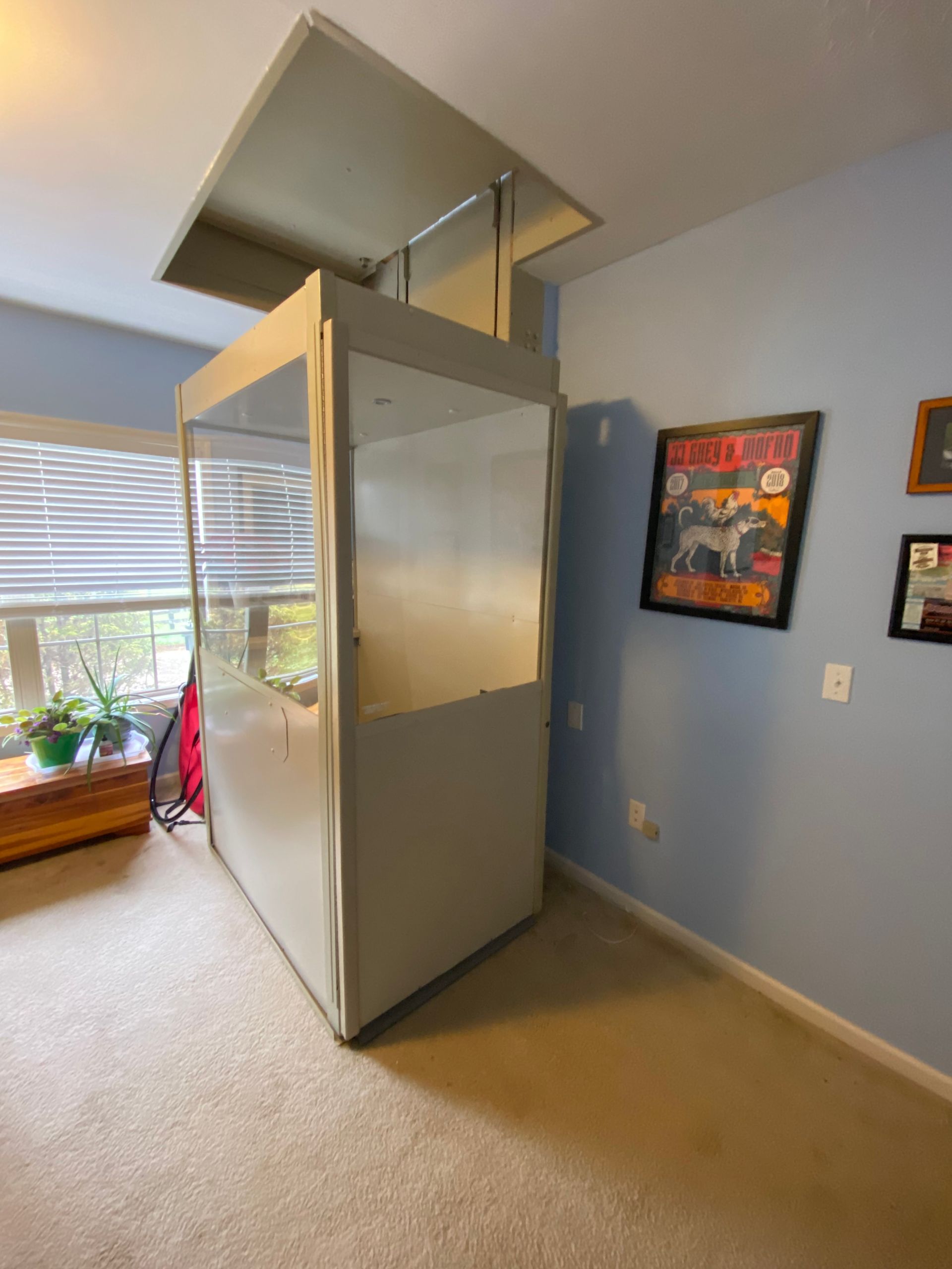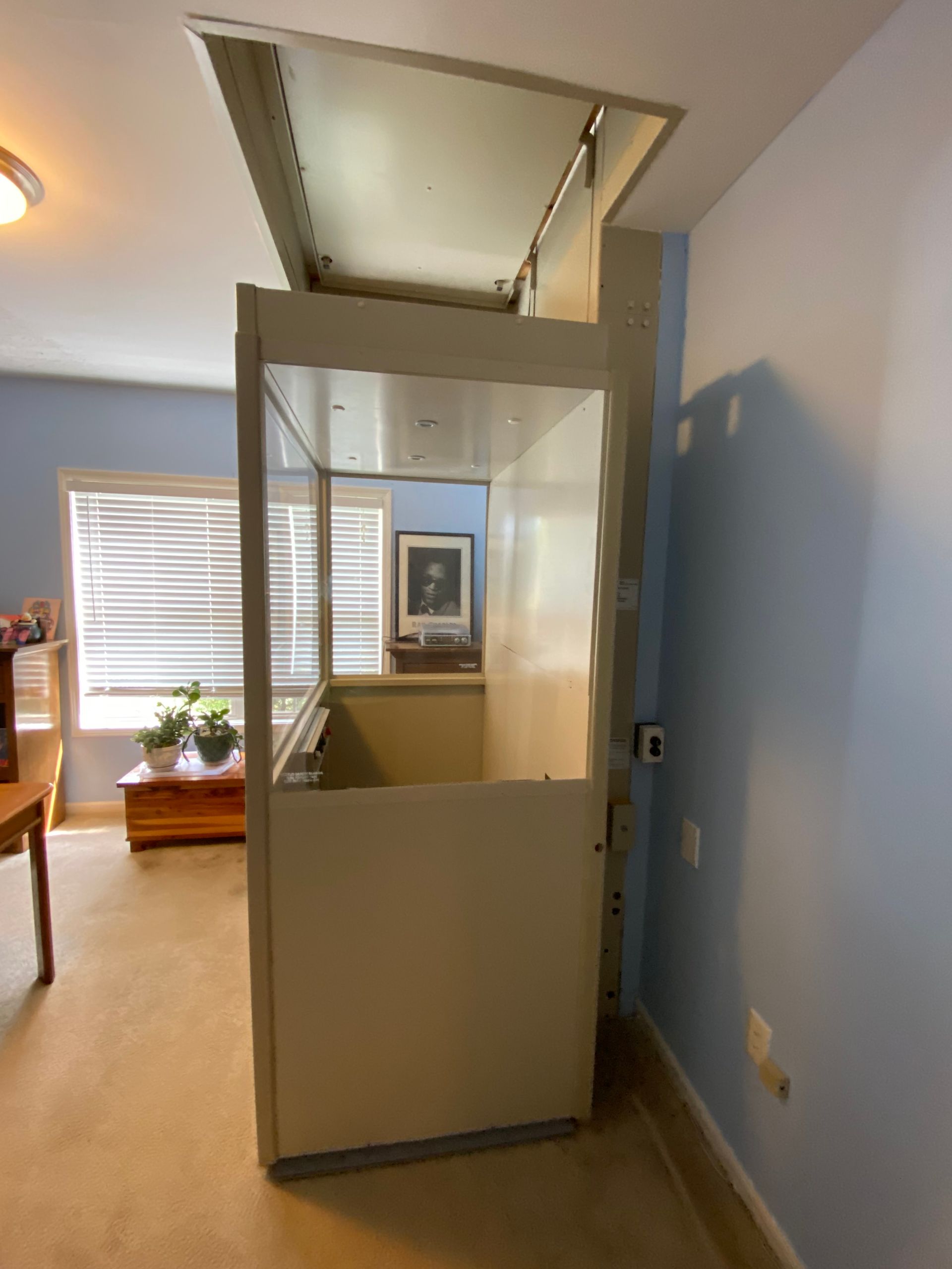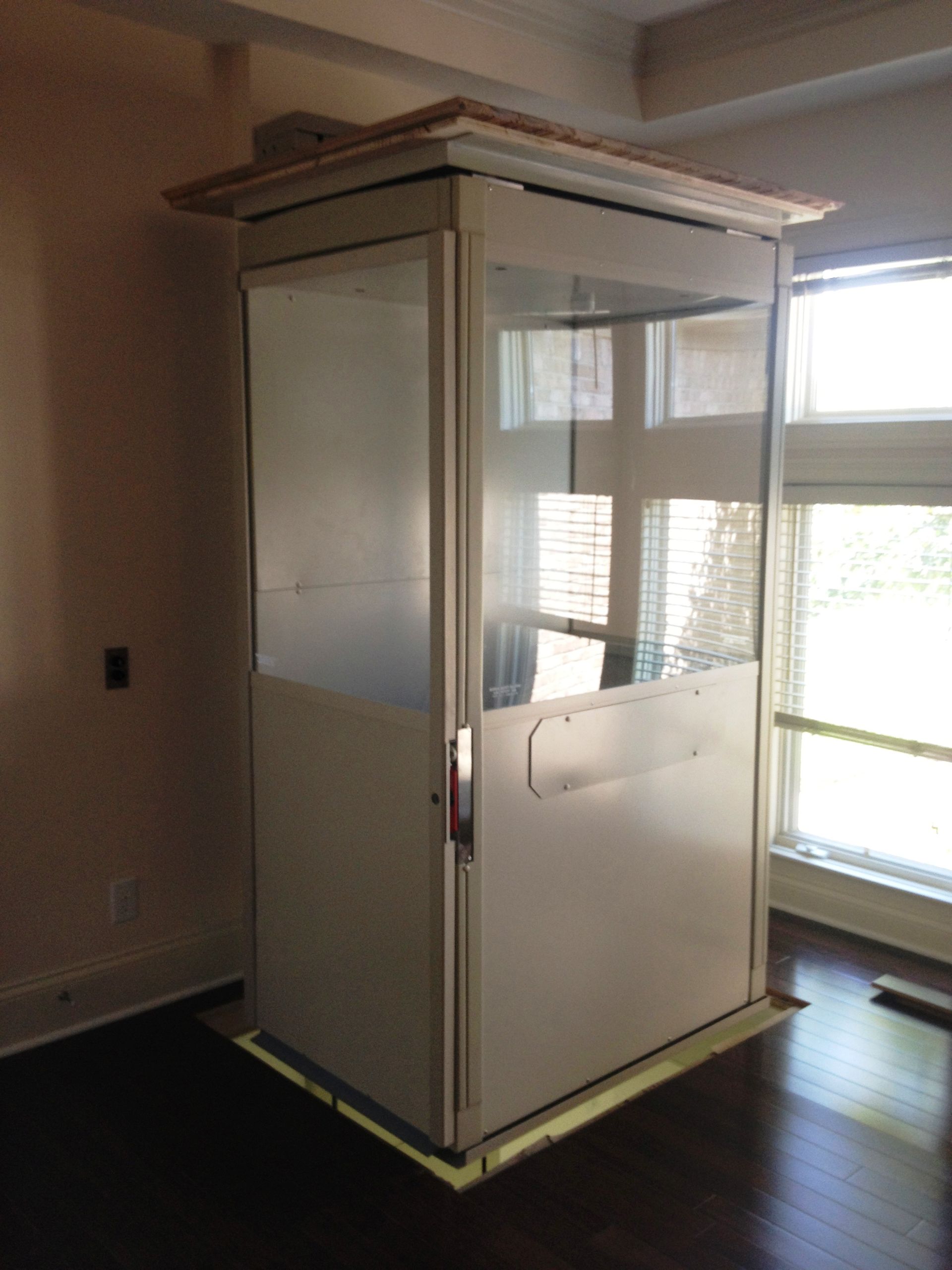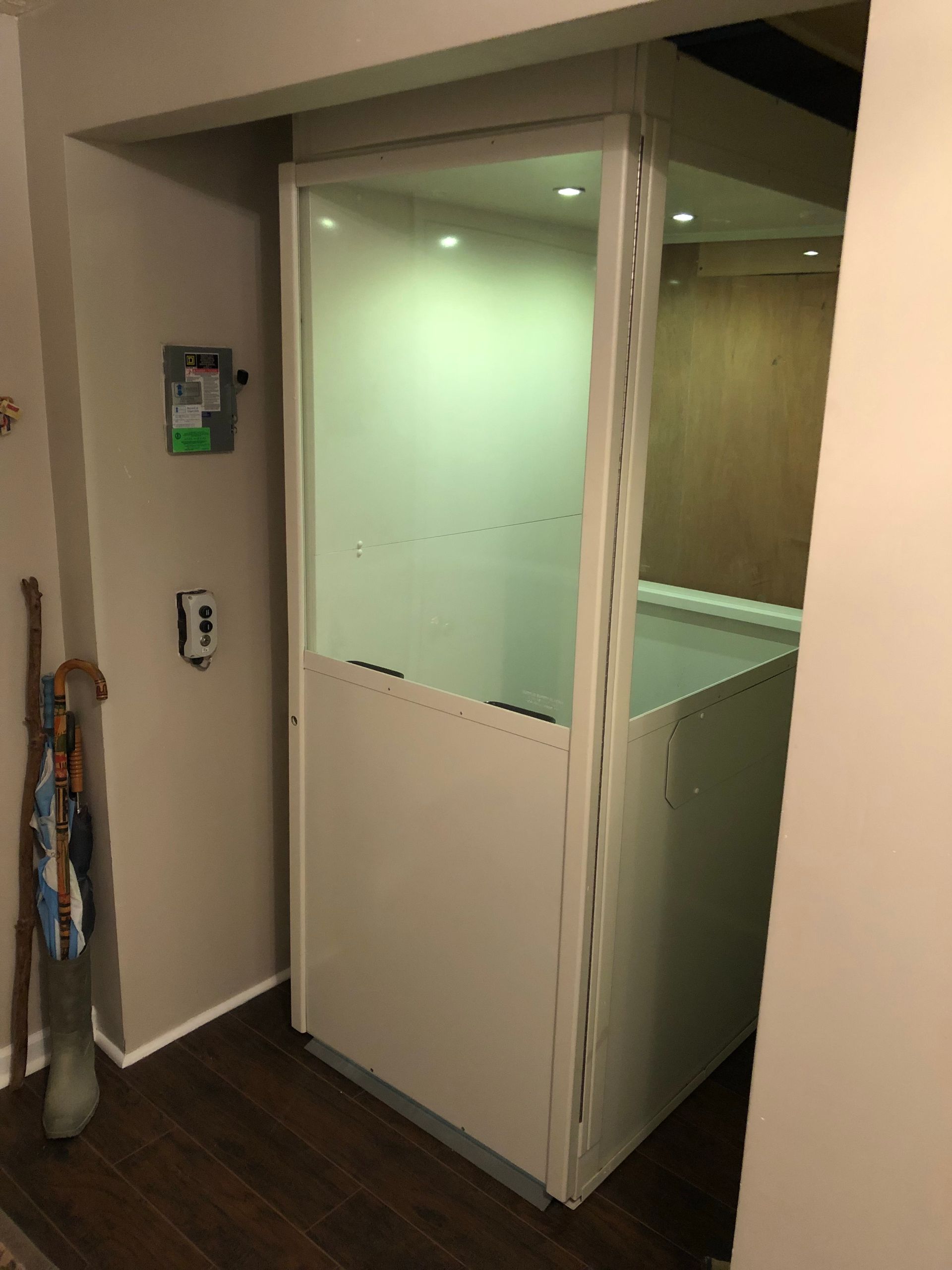The Telecab model is a lighter duty 500 pound capacity home lift with multiple configuration options. No hoist way or pit required. It has a fully enclosed drive tower designed for safety and aesthetics. It requires a less invasive construction project than a traditional home elevator, with only a support wall and floor cutout needed.