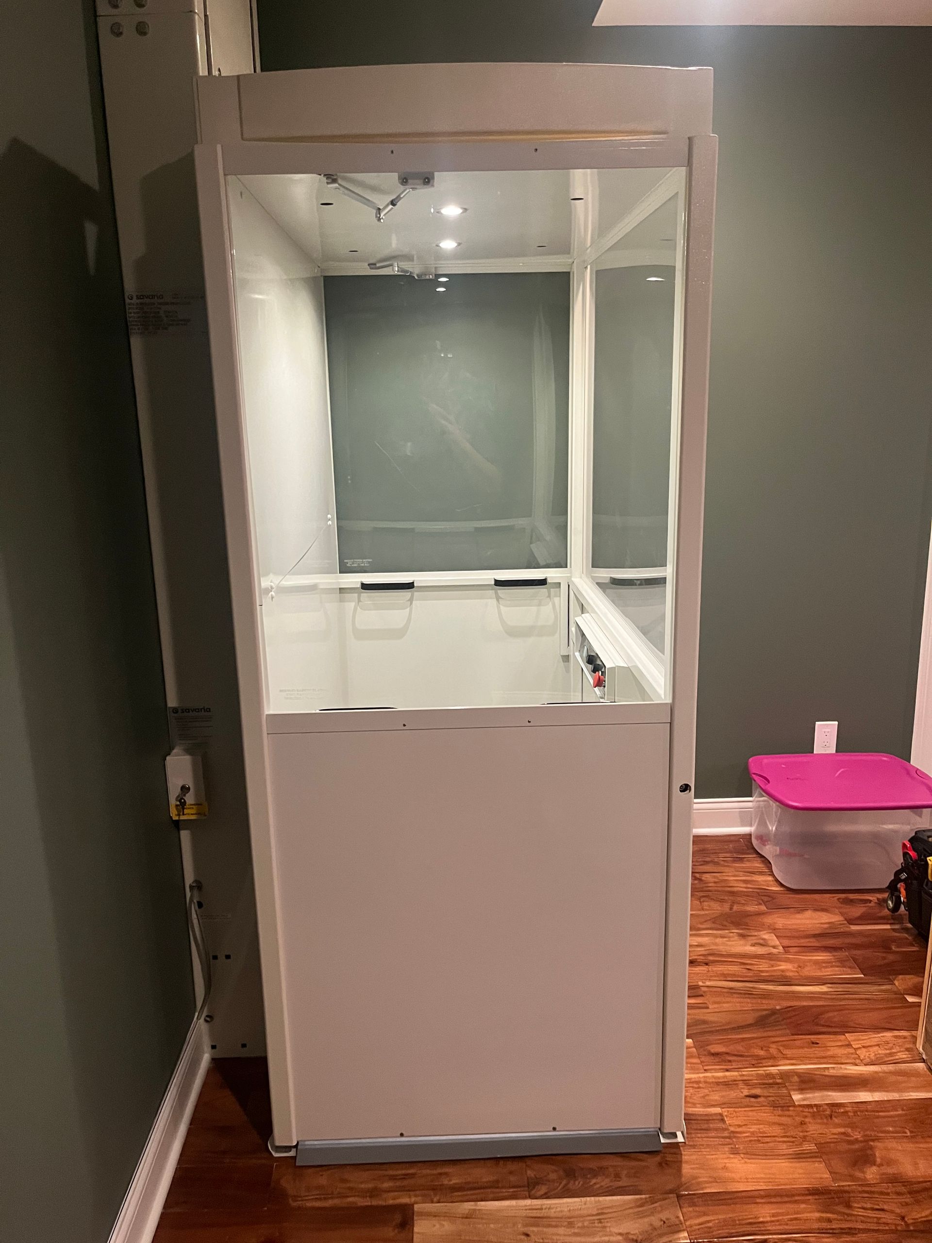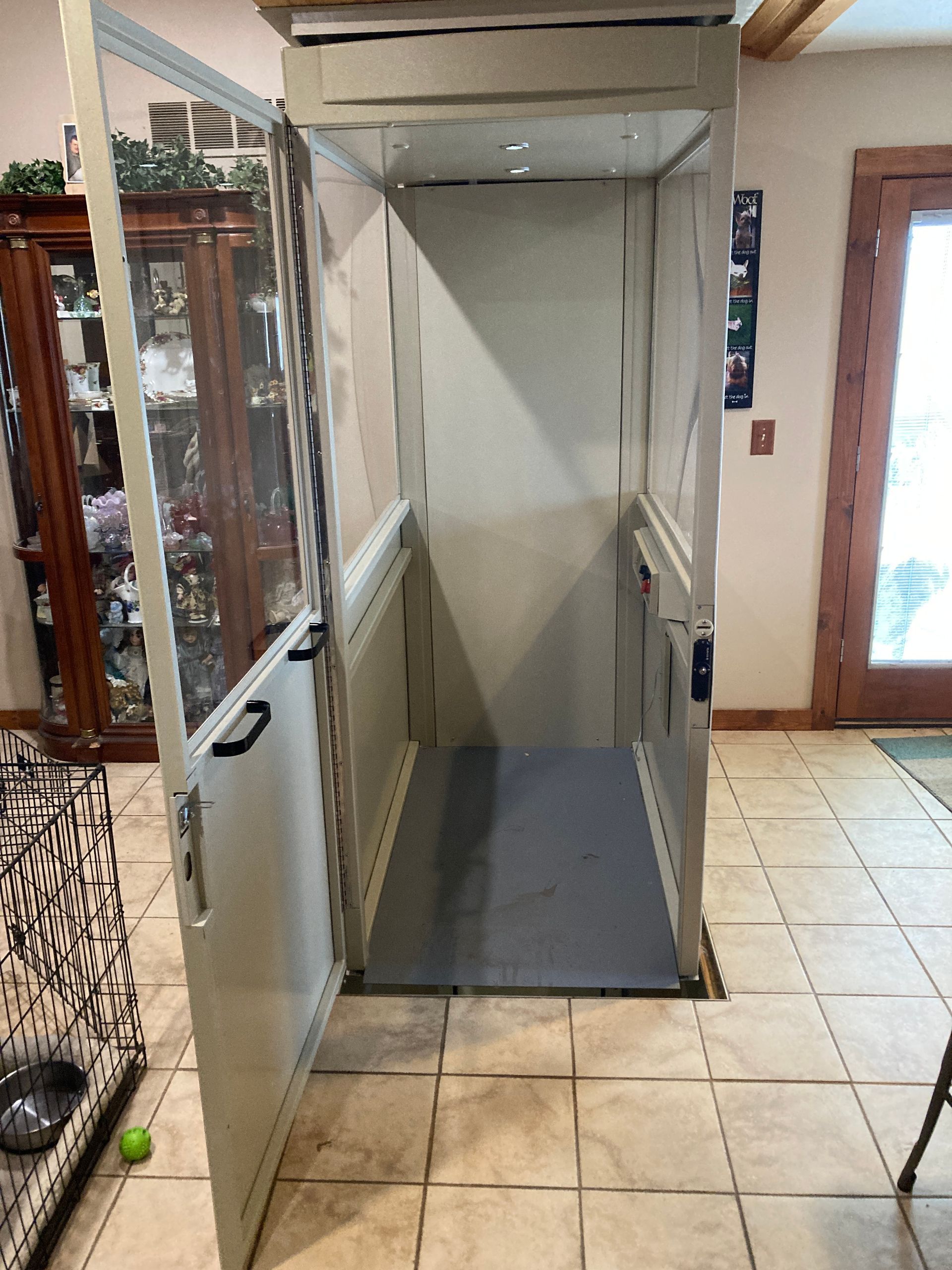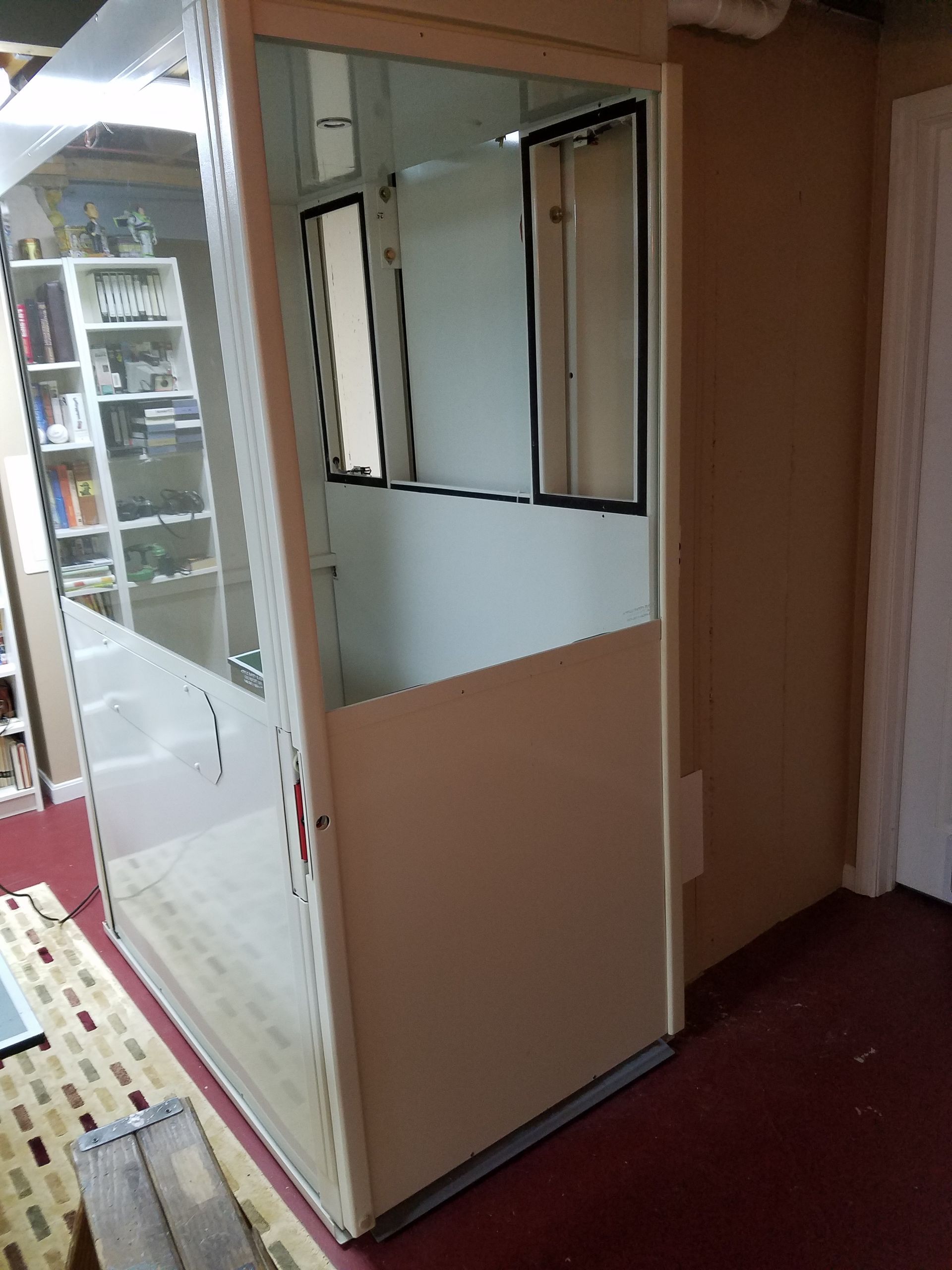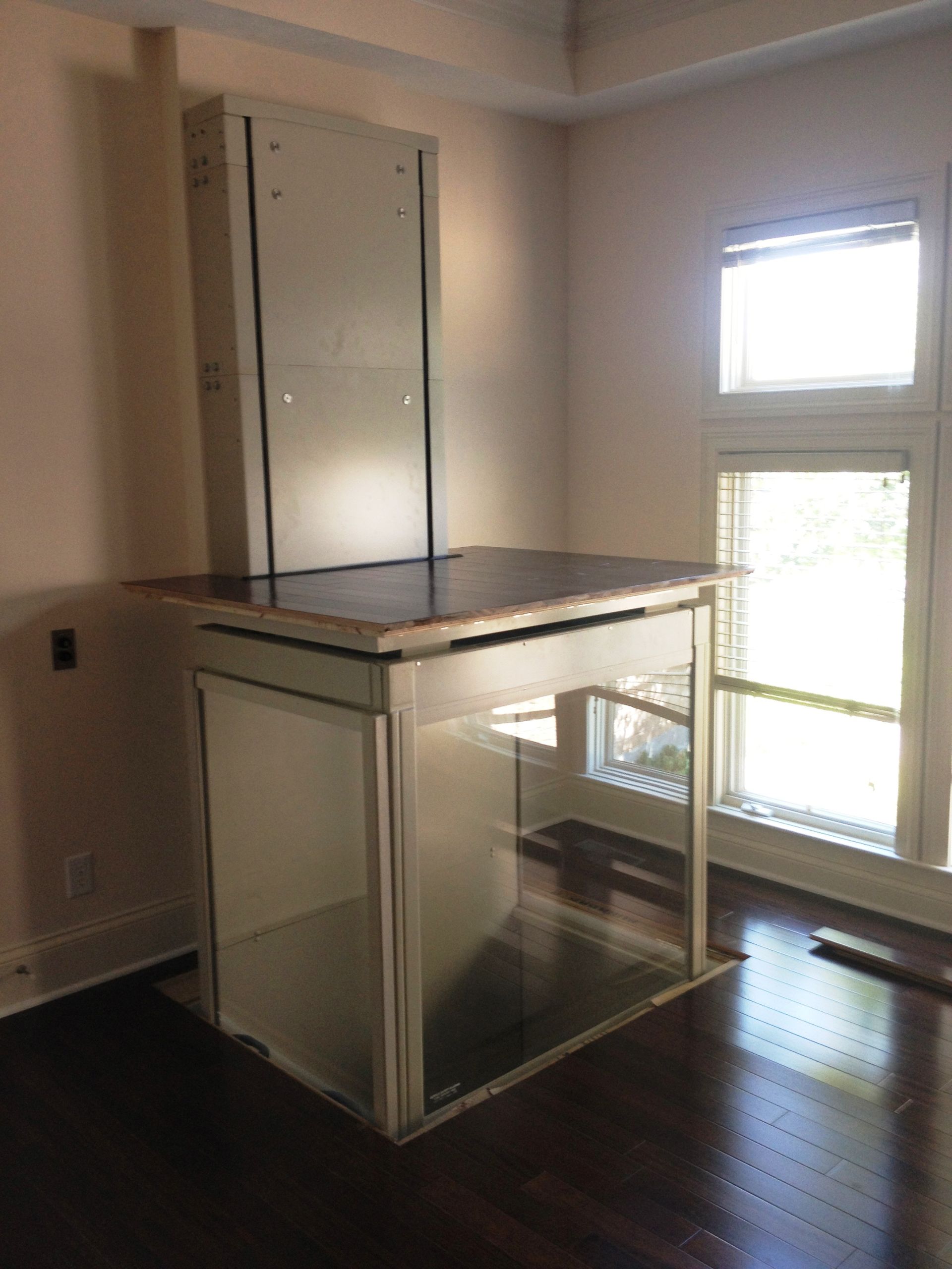 The Telecab model is a lighter duty 500 pound capacity home lift with multiple configuration options. No hoist way or pit required. It has a fully enclosed drive tower designed for safety and aesthetics. It requires a less invasive construction project than a traditional home elevator, with only a support wall and floor cutout needed.