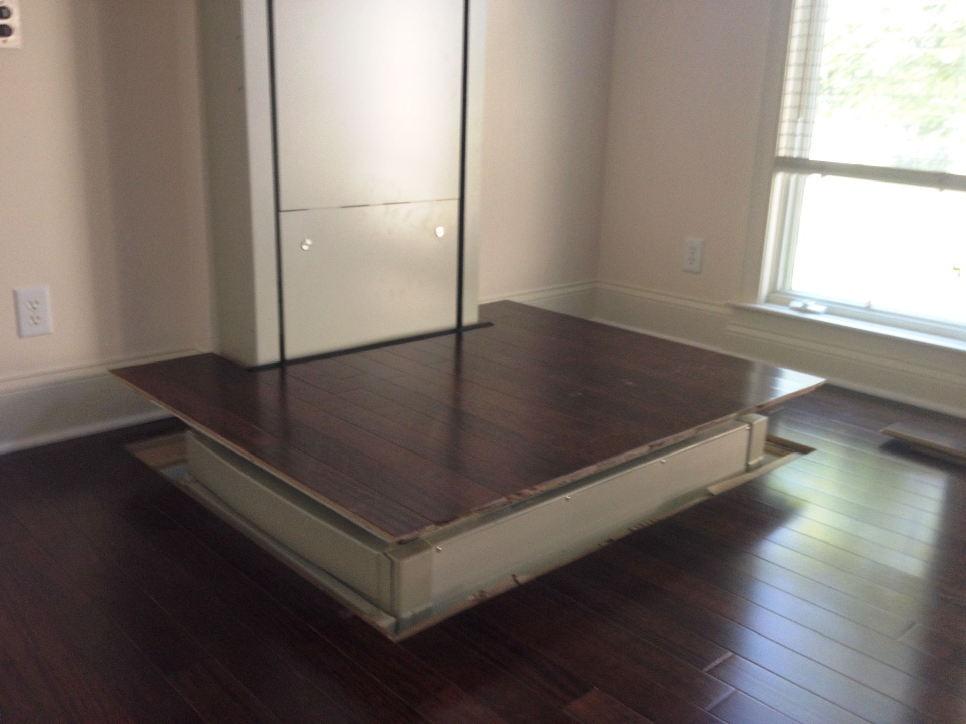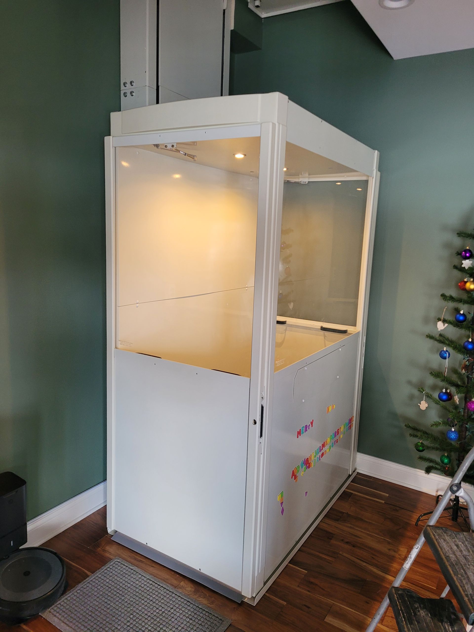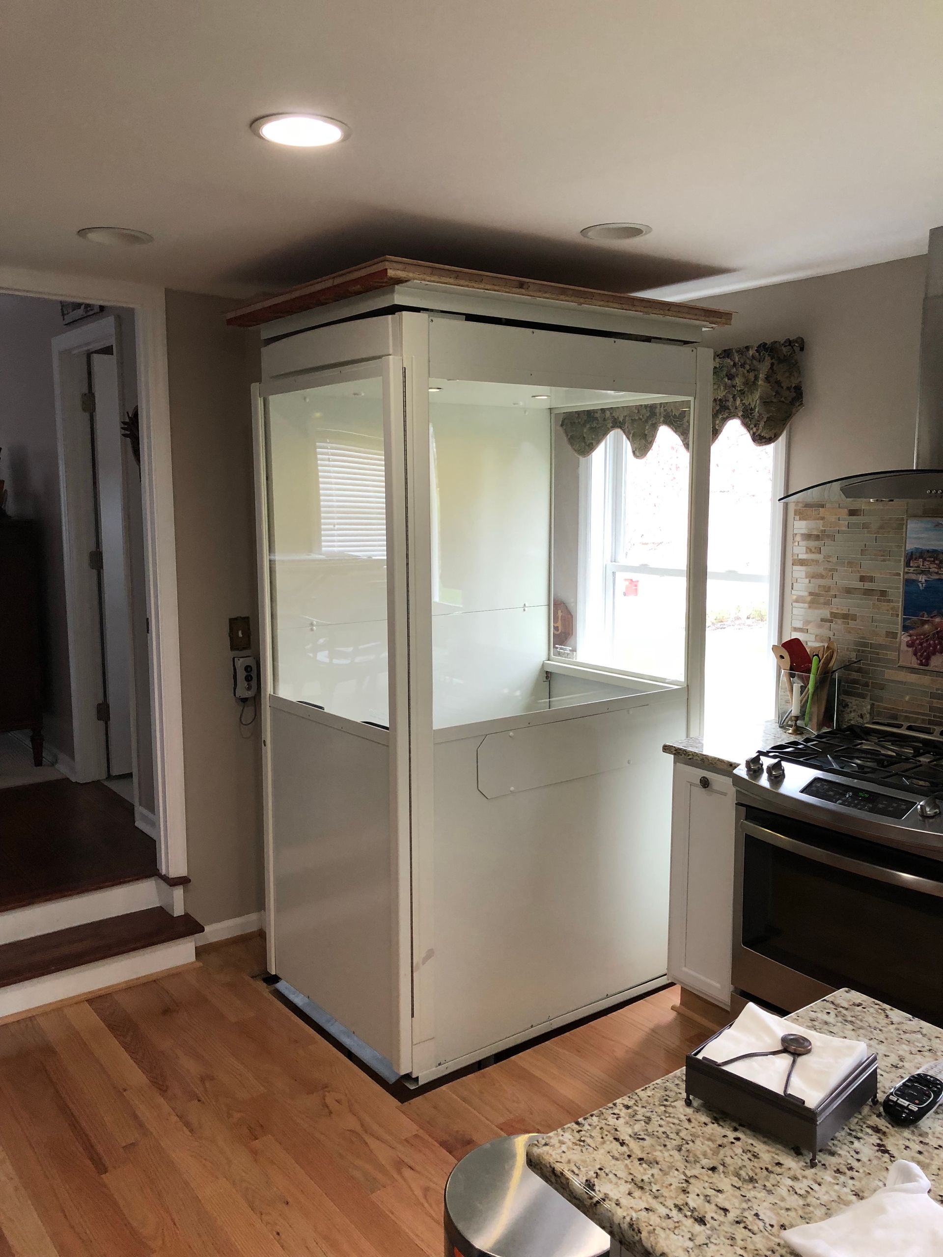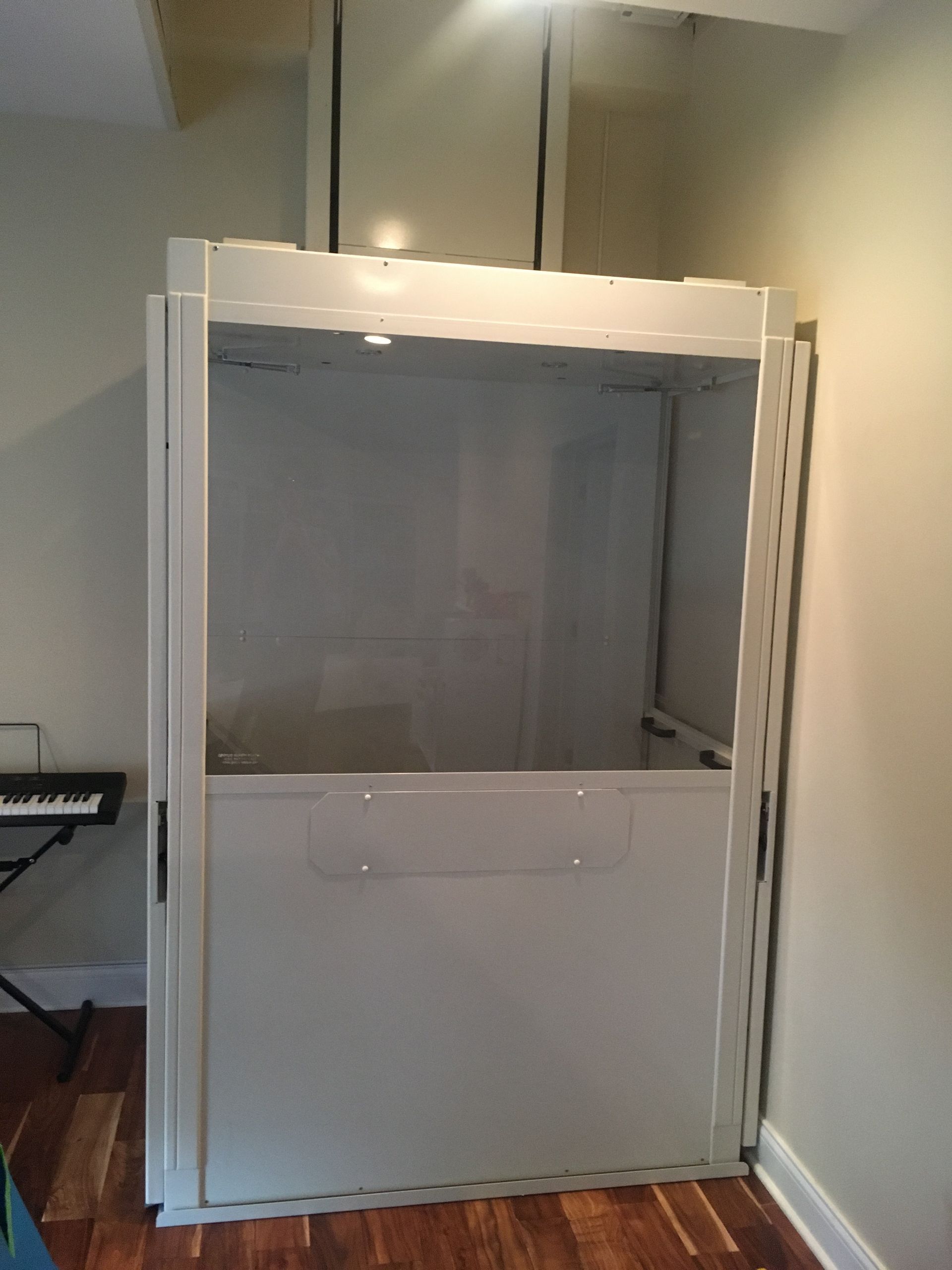 The Telecab model is a lighter duty 500 pound capacity home lift with multiple configuration options. No hoist way or pit required. It has a fully enclosed drive tower designed for safety and aesthetics. It requires a less invasive construction project than a traditional home elevator, with only a support wall and floor cutout needed.